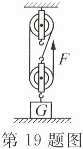 19. $ 30 $ $ 40 $ 解析:由图可知,动滑轮上承担物重的绳子段数 $ n = 3 $,不计绳的质量及轮与轴间的摩擦,则绳自由端的拉力 $ F = \frac{1}{n}(F_{\text{拉}} + G_{\text{动}}) $,所以,当绳自由端拉力 $ F $ 大小为 $ 30 \, \text{N} $ 时,滑轮组对重物的拉力 $ F_{\text{拉}} = nF - G_{\text{动}} = 3 \times 30 \, \text{N} - 20 \, \text{N} = 70 \, \text{N} $,则重物 $ G $ 对地面的压力 $ F_{\text{压}} = F_{\text{支}} = G - F_{\text{拉}} = 100 \, \text{N} - 70 \, \text{N} = 30 \, \text{N} $;重物 $ G $ 恰能匀速上升时,滑轮组对重物的拉力 $ F_{\text{拉}}' = G = 100 \, \text{N} $,此时绳端拉力 $ F' = \frac{1}{n}(G + G_{\text{动}}) = \frac{1}{3} \times (100 \, \text{N} + 20 \, \text{N}) = 40 \, \text{N} $。