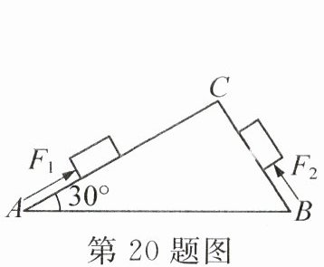 20. 如图所示,AC、BC为同一水平面上的两个光滑斜面,AC>BC,∠CAB= 30°。在相等时间内把重为80N的同一物体从斜面底端分别沿AC、BC匀速推至C点,物体的机械能____(选填“增大”“减小”或“不变”);若沿两个斜面的推力分别为$F_1、$$F_2,功率分别为P_1、$$P_2,则F_1____($选填“>”“<”或“=”,下同$)F_2,$$P_1____P_2。$