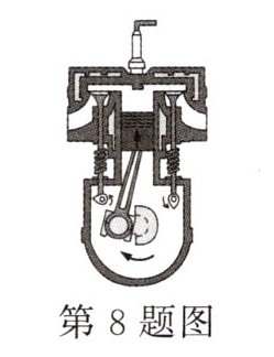 8. (5分)如图所示是单缸四冲程汽油机的______冲程;该汽油机的飞轮转速是2400r/min,则该汽油机每秒钟完成______个做功冲程.当汽车在行驶时,出现排气管冒"黑烟",此时汽油机的效率将______(选填"变大""不变"或"变小").汽油机工作时,需要用水为其降温,这是利用水的______大的特点;若100g水温度升高20℃,水吸收的热量为______J.[c水$= 4.2×10^3J/(kg·℃)]$