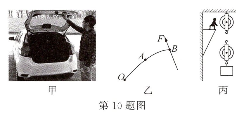 (1) 如图甲,某人抬起后备厢盖准备放东西.抬起后备厢盖的过程可将后备厢盖近似看成一个能绕O点转动的杠杆OAB,其简化示意图如图乙,请在图乙中画出动力F的力臂l.