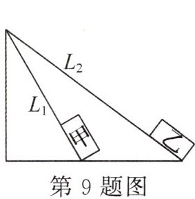 9. (3分)如图所示,用5N的推力将质量相同的甲、乙两物体分别沿斜面$L_1$和$L_2$从底端推至顶端.已知$L_1$斜面长$5m,L_2$斜面长8m,推力对甲物体做的功为______J;将甲物体从底端推上顶端做的有用功与将乙物体从底端推上顶端做的有用功比较,W甲有用______(选填">""<"或"= ",下同)W乙有用,对应斜面的机械效率η甲______η乙.