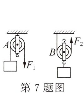 7. (3分)如图所示,滑轮______(选填"A"或"B")可以看作是等臂杠杆;若物体所受重力均为20N,滑轮重均为4N,当物体匀速上升时,不计绳重及摩擦,力$F_2$的大小为______N,滑轮B的机械效率约是______.