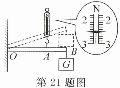 21. $ 90\% $ $ 0.3 $ 解析:由图可知,弹簧测力计的读数即拉力为 $ 2.5 \, \text{N} $,拉力所做的有用功 $ W_{\text{有用}} = Gh = 1.5 \, \text{N} \times 0.3 \, \text{m} = 0.45 \, \text{J} $,拉力做的总功 $ W_{\text{总}} = Fs = 2.5 \, \text{N} \times 0.2 \, \text{m} = 0.5 \, \text{J} $,则杠杆的机械效率 $ \eta = \frac{W_{\text{有用}}}{W_{\text{总}}} \times 100\% = \frac{0.45 \, \text{J}}{0.5 \, \text{J}} \times 100\% = 90\% $;不计整个机械的摩擦,克服杠杆的重力所做的额外功 $ W_{\text{额外}} = W_{\text{总}} - W_{\text{有用}} = 0.5 \, \text{J} - 0.45 \, \text{J} = 0.05 \, \text{J} $,物块上升的高度 $ h $ 为 $ 0.3 \, \text{m} $,则杠杆的重心上升的高度 $ h' = \frac{h}{2} = \frac{0.3 \, \text{m}}{2} = 0.15 \, \text{m} $,杠杆的重力 $ G' = \frac{W_{\text{额外}}}{h'} = \frac{0.05 \, \text{J}}{0.15 \, \text{m}} \approx 0.3 \, \text{N} $。