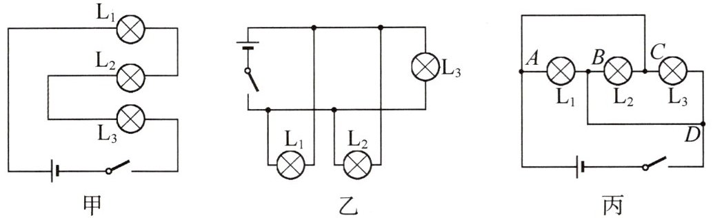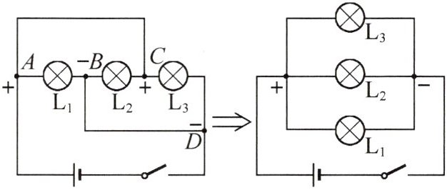 【思路分析】(1)利用电流路径法分析甲图:开关闭合后,电流从电源正极出发,依次经过灯泡$L_{1}$、$L_{2}$、$L_{3}$,再回到负极,电流路径有1条.(2)利用拆除法分析乙图:开关闭合后,将灯泡$L_{1}$拆除,灯泡$L_{2}$、$L_{3}$能正常工作.(3)利用节点法分析丙图:开关闭合后,$A$、$C$两点可以看作一个点,均可视为连接电源“+”极,$B$、$D$两点可以看作一个点,均可视为连接电源“-”极(如图所示),灯泡$L_{1}$、$L_{2}$、$L_{3}$的两端均连接电源两极.
