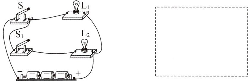 【思路分析】电流从电源正极出发,分成两条支路,分别经$L_{1}和L_{2}$、$S_{1}后在S$处汇合,再回到电源负极,两灯并联,$S$为干路开关,$S_{1}只控制L_{2}$.