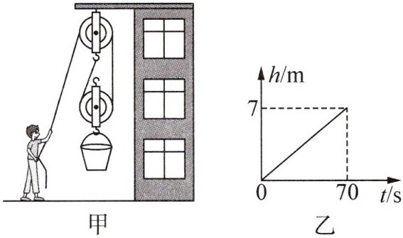 (2) 由图乙可知, 将重物匀速提升 $ 7 \, \text{m} $ 所用的时间 $ t = 70 \, \text{s} $, 则在匀速提升重物的过程中, 工人拉绳子的功率 $ P = \frac{W}{t} = \frac{Fs}{t} = \frac{250 \, \text{N} \times 14 \, \text{m}}{70 \, \text{s}} = 50 \, \text{W} $.