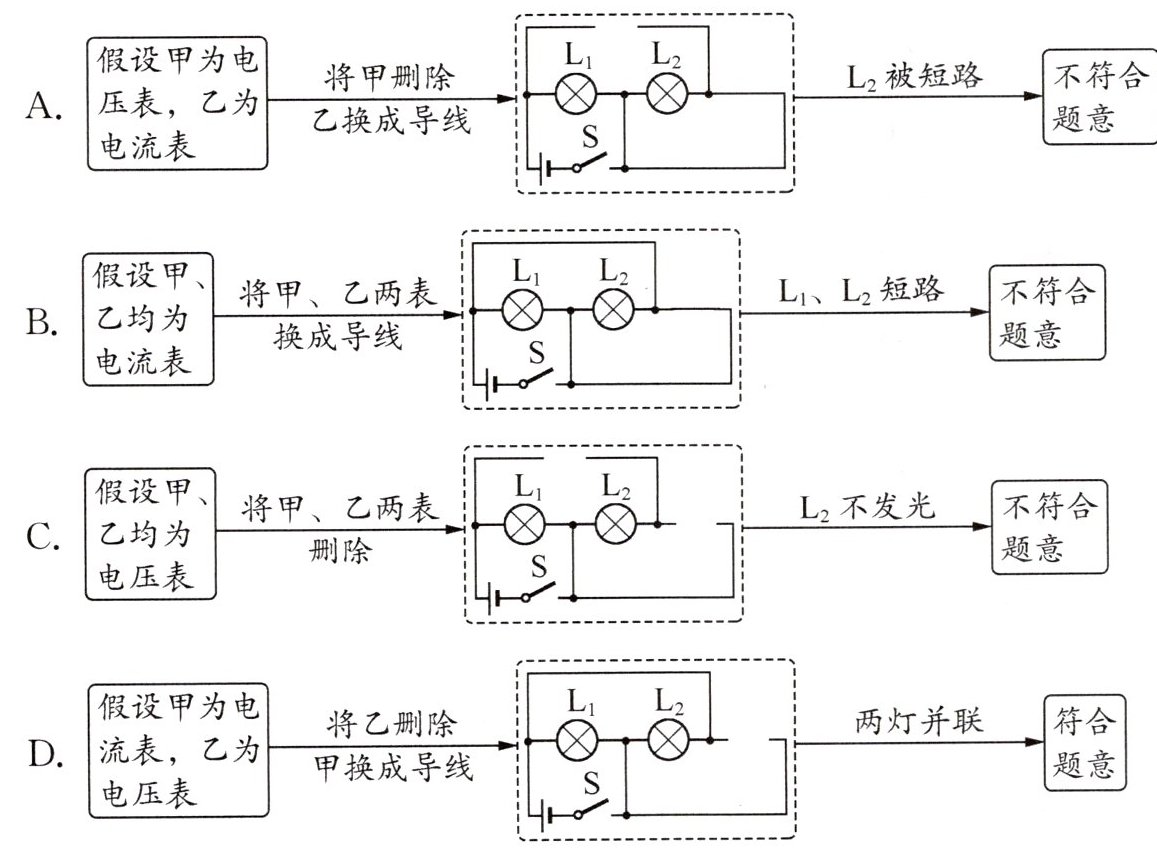 典例3 如图所示的电路中,甲、乙两处分别接入电流表或电压表,当开关S闭合后,两灯均发光,则下列接法正确的是()