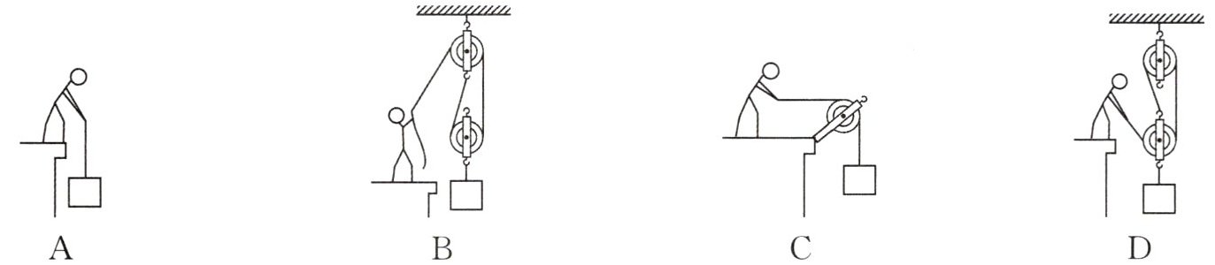 8. (2分)工人师傅要将重物提升,若不计滑轮重、绳重及摩擦,且工人师傅施加的拉力一定,能一次性吊起最多重物的方法是下列图中的 ()