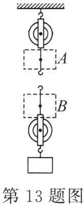 13. 新素养 科学思维 (2分)如图所示,在A处或B处的虚线框内添加一个滑轮,利用三个滑轮组成滑轮组,要求使用时最省力,添加滑轮并完成滑轮组的绕法.