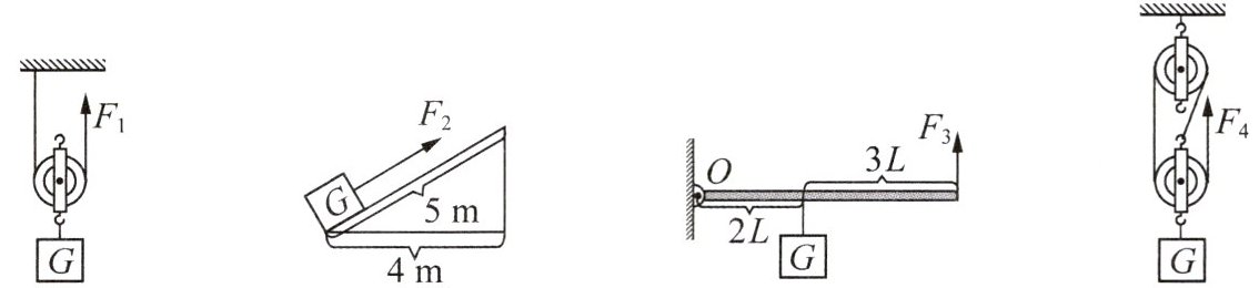 (3)$F_{2}\gt F_{1}\gt F_{3}\gt F_{4}$ 解析:使用四种简单机械匀速提升同一物体,物体重力为 G,不计摩擦及绳、杆、滑轮重。第一个图使用的是动滑轮,拉力$F_{1}=\frac{1}{2}G$;第二个图使用的是斜面,斜面高$h=\sqrt{(5m)^{2}-(4m)^{2}}=3m$,斜面长$s = 5m$,将物体从底端匀速拉到顶端,所做额外功为 0 J,则总功等于有用功,即$F_{2}s = Gh$,代入数据有$F_{2}×5m = G×3m$,则$F_{2}=\frac{3}{5}G$;第三个图使用的是杠杆,动力臂为$3L + 2L = 5L$,阻力臂为 2L,由杠杆的平衡条件可得$F_{3}×5L = G×2L$,则$F_{3}=\frac{2}{5}G$;第四个图使用的是滑轮组,$n = 3$,拉力$F_{4}=\frac{1}{3}G$。由以上分析可知,将$F_{1}$、$F_{2}$、$F_{3}$、$F_{4}$从大到小依次排列为$F_{2}\gt F_{1}\gt F_{3}\gt F_{4}$。