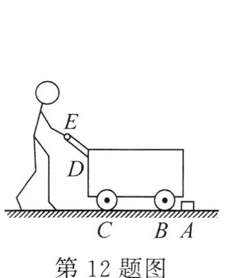 12. (2025·江苏宿迁质检·2分)列车上食品常常放在如图所示的小推车上,若货物均匀摆在车内,当前轮遇到障碍物A时,售货员向下按把,这时手推车可以视为杠杆,画出此时售货员最省力的力臂和力的方向.
