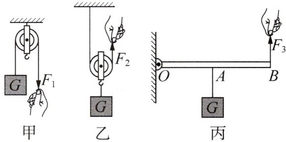 3. (2025·江苏南京期末·2分)如图所示,用甲、乙、丙三种简单机械分别提起同一重物G,已知滑轮重20N,杠杆($OB= 2OA$)重10N,手的拉力始终沿竖直方向,忽略绳重及摩擦,下列说法错误的是 ()