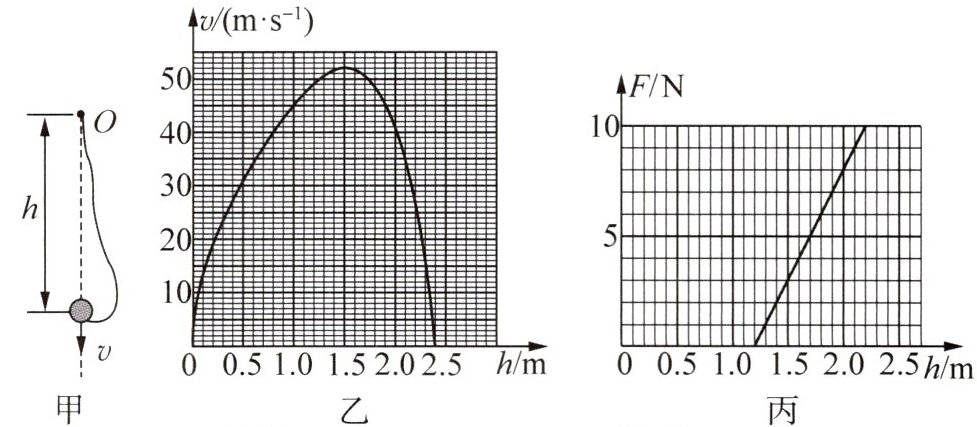 4. (2025·江苏常州期末·2分)蹦极运动简化后与下列情景相似:如图甲所示,弹性细绳的一端固定在O点,另一端系着一个小球,小球从O点释放后上下往复运动,最终会停在O点下方的某个位置.已知小球速度v与下落高度h的关系如图乙所示,细绳拉力F与下落高度h的关系如图丙所示.根据图像可知,下列描述正确的是 ()