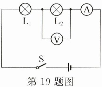 19. 在如图所示的电路中,灯$L_1、$$L_2$是____(选填“串联”或“并联”)的,接通电路后各部分电路都正常。如果将电流表与电压表互换位置,那么电流表的示数将____(选填“变大”“变小”或“不变”,下同),电压表的示数将____。