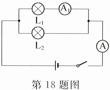 18. 如图所示电路中,电源电压为3V,开关闭合后,电流表A的示数为0.3A,电流表$A_1$的示数为0.2A。电路中灯泡$L_1、$$L_2$的连接方式是____联,灯泡$L_1$两端的电压为____V,通过灯泡$L_2$的电流为____A。