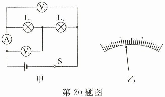 20. 如图甲,S闭合后$,V_1、$$V_2、$A三只电表的指针均如图乙,已知电流表接入的是“-”“0.6”两个接线柱,此电路是____(选填“串联”或“并联”)电路,通过$L_2$的电流是$____A,L_2$两端的电压是____V。