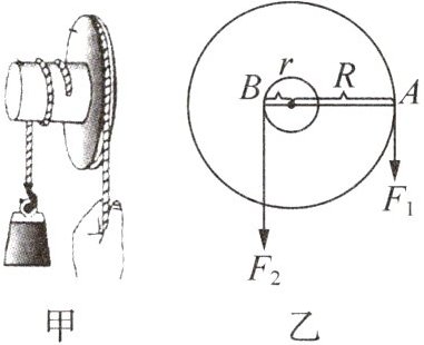 4. 如图甲所示是常用来提升重物的轮轴,它也是一种变形杠杆,图乙是它的杠杆示意图.若图乙中R= 4r,重物的拉力$F_2= 600N,$作用在A点的动力$F_1= 200N,$则轮轴的机械效率η= ______.