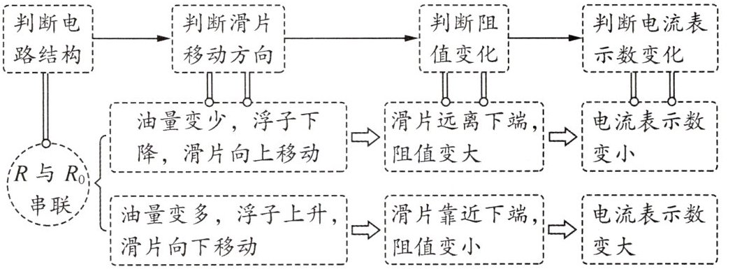 典例4 如图所示是一种测定油箱内油量的装置,其中R是滑动变阻器的电阻片,滑动变阻器的滑片和滑竿相连,滑竿可绕固定轴O转动,另一端固定着一个浮子,下列说法正确的是 ()