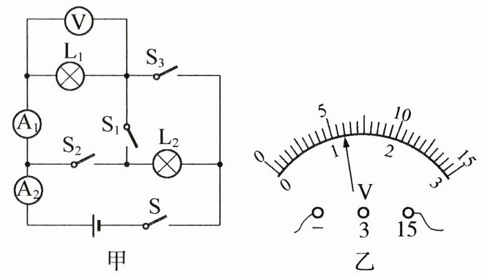 (3)由图甲可知,当断开开关$S_{2}$和$S_{3}$、闭合开关S和$S_{1}$时,两灯泡串联,电压表测灯泡$L_{1}$两端的电压,因为串联电路两端的总电压等于各部分电路两端的电压之和,所以灯泡$L_{1}$两端的电压小于电源电压,则此时电压表的量程为0~3V,由图乙可知,此时电压表的示数即灯泡$L_{1}$两端的电压$U_{1}'=1.2V$,则灯泡$L_{2}$两端的电压$U_{2}'=U-U_{1}'=6V-1.2V=4.8V$.