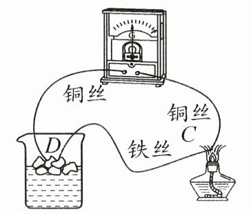 1821年,德国物理学家塞贝克发现了一种奇怪的现象:如图所示,把两根铜丝和一根铁丝与灵敏电流计串联成闭合电路,然后把铜丝和铁丝的一个连接点D放在盛有冰水混合物的容器里保持低温,另一个连接点C放在火焰上加热,发现灵敏电流计的指针发生了偏转,表明这时闭合电路中产生了电流,塞贝克把这种电流叫作“热电流”,把这种电路叫“热电偶电路”。
