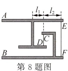 8. 新素养科学思维(2025·江苏常州质检·3分)小明在学校选修课《小牛顿实验室》上做出了一个张拉结构——悬浮桌,图中阴影部分A为桌面部分、B为桌子的底架,这两部分之间仅靠竖直软绳CD和EF相连.已知A重40N且左右对称、质量分布均匀,软绳CD到A的竖直对称轴以及EF的距离分别为$l_1= 20cm$和$l_2= 40cm.$经分析可知,软绳EF对桌面A的作用力大小为______N,方向向______(选填“上”或“下”);软绳CD对A的作用力大小为______N.