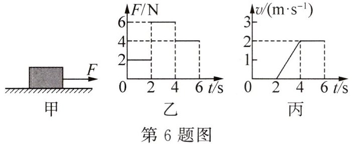 6. (2025·江苏南京期中·3分)如图甲所示,放在水平地面上的物体,受到水平向右的拉力F的作用,F的大小与时间的关系如图乙所示,物体运动的速度与时间的关系如图丙所示.则0~2s拉力做的功为______J,2~4s物体的机械能______(选填“变大”“变小”或“不变”),4~6s拉力的功率为______W.