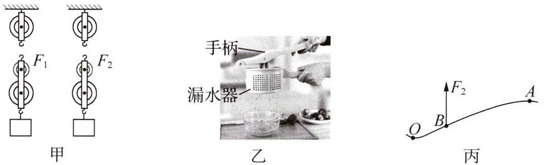 (2) 随着社会的发展和科技的进步,工具的种类越来越多,工具的使用极大地方便了人们的生活.如图乙是一种蔬菜挤水器,其手柄可以看作一个杠杆,图丙是其简化示意图,请在图丙中画出:阻力$F_2$的力臂$L_2;$在A点施加的最小动力$F_1$的示意图.