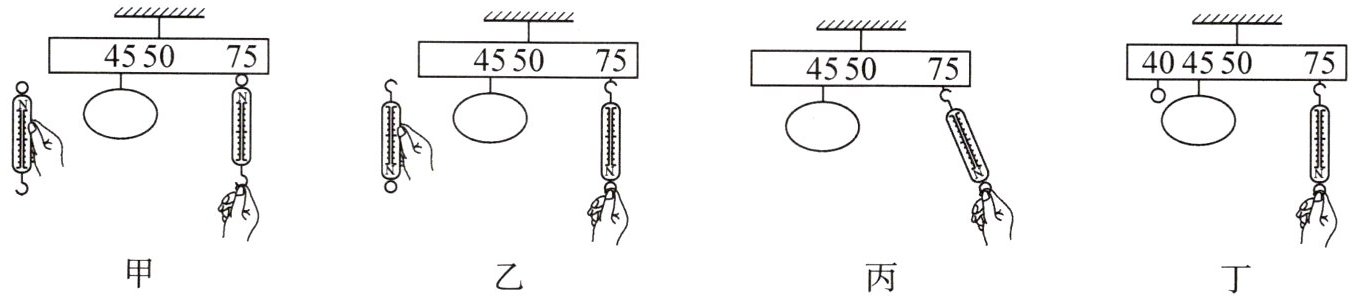 (5) 小明发现:如图乙和图丙所示,先后竖直向下和斜向下拉弹簧测力计,均使米尺在水平位置平衡时,弹簧测力计两次的示数分别为F和F',你认为F______(选填“>”“<”或“=”)F'.