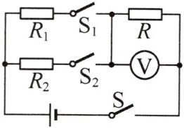 闭合S、$S_{2}$,断开$S_{1}$时:$R_{2}$、R串联,电压表测R两端电压