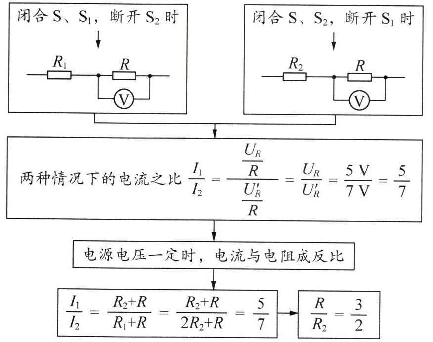 两种情况下的电流之比$\frac{I_{1}}{I_{2}}= \frac{\frac{U_{R}}{R}}{\frac{U_{R}'}{R}}= \frac{U_{R}}{U_{R}'}= \frac{5V}{7V}= \frac{5}{7}$