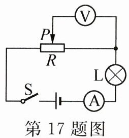 17. 如图所示,已知电源电压为10V,将滑动变阻器滑片P移到最左端,闭合开关S,灯泡发光,电流表示数为0.35A,电压表示数为7V,则此时滑动变阻器接入电路的电阻是____Ω;在滑片P向右移动的过程中,电流表的示数将____(选填“变大”“不变”或“变小”,下同),电压表示数将____。