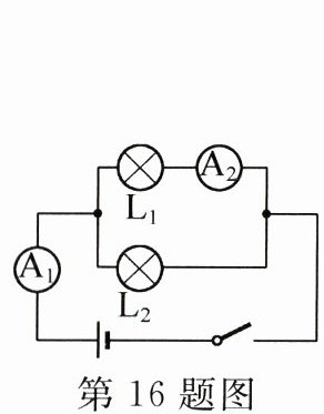 16. (2024·山东滨州)如图,电源电压为3V,闭合开关后,电流表$A_{1}$的示数为0.6A,$A_{2}$的示数为0.2A,则通过灯泡$L_{2}$的电流为____A,灯泡$L_{1}$的阻值为____Ω。