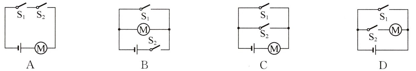 A 解析:由题意可知,只有开关$ S_{1} $和$ S_{2} $同时闭合时,电动机才能工作,则两个开关相互影响,应串联在电路中控制电动机,故A符合要求。