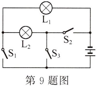 9. (2分)在如图所示的电路中,要使灯泡$L_{1}$、$L_{2}$串联在电路中,应闭合开关____;若要使$L_{1}$、$L_{2}$并联在电路中,应闭合开关____.