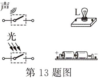 13. (2分)楼道里有一种声控加光控的照明电路,声控和光控电路都相当于开关.夜晚光线很弱时,光控开关闭合,当有人走动发出声音时,声控开关闭合,电路被接通,楼道灯发光.在白天,即使楼道内发出声音使声控开关闭合,光控开关仍断开,楼道灯不会亮.这样既保障了居民的出入安全,又节约了电能.如图,请添加导线完成连接,使电路满足上述要求.