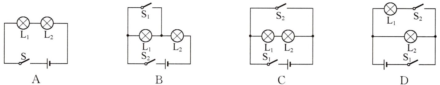 8. (2025·江苏徐州期中·2分)上分点三 如图所示的电路中,当开关全部闭合时,灯泡$L_{1}$、$L_{2}$组成串联电路的是()