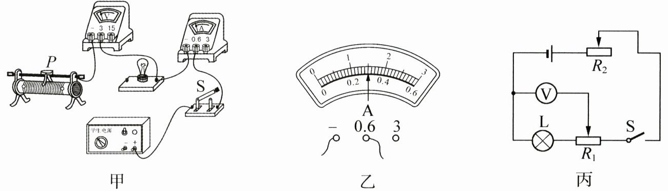(4)实验结束后,小明发现桌面上还有另一只小灯泡,如图丙,小明只利用了电压表和两只滑动变阻器(最大阻值分别为$R_{1}和R_{2}$),也巧妙地测出了这只灯泡正常发光时的电阻。在他的测量中,闭合开关S后,应先将$R_{1}$的滑片移至最____(选填“左”或“右”)端,并调节$R_{2}$的滑片至适当位置使灯泡正常发光,读出此时电压表示数为$U_{0}$,最后再____,并读出电压表的示数为$U(U>U_{0})$,则灯泡正常发光时的电阻的表达式$R_{L}= $____(用题中出现的物理量的符号表示)。