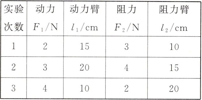 (2) 分析实验数据,可以看出:动力 $F_{1}$ 与动力臂 $l_{1}$ 的乘积等于阻力 $F_{2}$ 与阻力臂 $l_{2}$ 的乘积,即 $F_{1}l_{1}=F_{2}l_{2}$. 这就是杠杆的平衡条件.