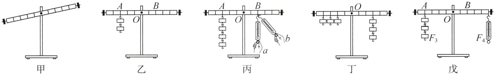 (6) 批判质疑 如图戊所示,小华进行实验时通过弹簧测力计来施加动力,测量并记录了多组数据,分析所测数据后,小华发现,每次实验都是$F _ { 3 } l _ { 3 } > F _ { 4 } l _ { 4 }$,这种情况显然不是误差造成的,经过分析,排除了$l _ { 3 }$、$F _ { 3 }$、$l _ { 4 }$发生测量错误的可能性.那么,为什么每次测出来的动力都偏小呢?原因是____.请你帮他想出一种合适的方法解决这个问题:____.