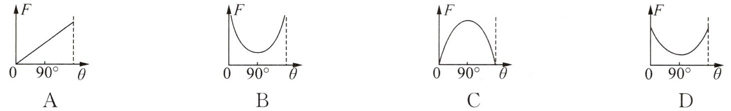 (4)当测力计和杠杆的夹角从$0^{\circ}$逐渐增加到$90^{\circ}$时,动力臂越来越大,动力越来越小,当测力计和杠杆垂直时,动力臂最大,动力最小,当测力计和杠杆的夹角从$90^{\circ}$逐渐增加到$180^{\circ}$时,动力臂越来越小,动力越来越大;由于θ为$0^{\circ}$或$180^{\circ}$时,动力臂为0,杠杆不可能平衡,故A、C、D错误,B正确.