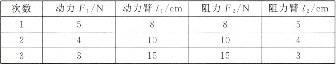 (3)由表可得,第一组数据:$F_{1}l_{1}=5N×8cm=8N×5cm=F_{2}l_{2}$,第二组数据:$F_{1}l_{1}=4N×10cm=10N×4cm=F_{2}l_{2}$,第三组数据:$F_{1}l_{1}=3N×15cm=15N×3cm=F_{2}l_{2}$,综上所述,该同学得出的结论为$F_{1}l_{1}=F_{2}l_{2}$.