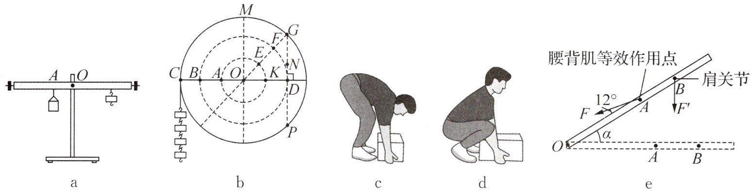(9) 模型建构 实验完成后,小明想起,人们从地面上搬起重物时,常见的做法是直接弯腰(如图c)或下蹲弯曲膝盖(如图d)将重物搬起,哪种做法更好呢?下面建立模型说明这个问题.将人的脊柱简化为杠杆,如图e所示,脊柱可绕骶骨(轴)O转动,腰背部复杂肌肉的等效拉力$F$作用在A点,其实际作用方向与脊柱夹角为$12 ^ { \circ }$且保持不变.搬箱子时的拉力$F ^ { \prime }$作用在肩关节B点,在B点挂一重物代替箱子.用测力计沿$F$方向拉,使模型静止,可测出腰背部复杂肌肉拉力的大小.接着,改变脊柱与水平面的夹角即改变杠杆与水平面的夹角$\alpha$,多次实验得出结论.