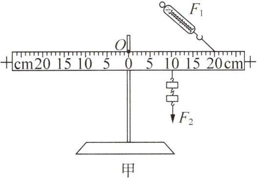 (2) 由图甲可知, $F_{2}$ 的力臂 $l_{2}=10.0 \mathrm{~cm}=0.1 \mathrm{~m}$; 当 $F_{2}$ 的大小为 $1 \mathrm{~N}$ 时, $F_{1}$ 竖直向上拉杠杆, 此时 $F_{1}$ 的力臂 $l_{1}=20.0 \mathrm{~cm}=0.2 \mathrm{~m}$, 由杠杆的平衡条件可得 $F_{1}l_{1}=F_{2}l_{2}$, $F_{1}=\frac{F_{2} l_{2}}{l_{1}}=\frac{1 \mathrm{~N} \times 0.1 \mathrm{~m}}{0.2 \mathrm{~m}}=0.5 \mathrm{~N}$.