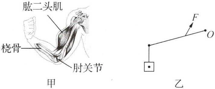3. (2024·四川巴中)图甲为人用手提物体时的情境.手臂桡骨在肱二头肌的牵引下绕肘关节转动的模型如图乙,请在图乙中作出力F的力臂L及物体所受重力的示意图.