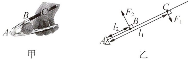 2. (2024·安徽)如图甲所示,用核桃钳夹核桃时,用力握紧手柄即可夹碎核桃.将上部的手柄ABC简化为如图乙所示的杠杆,若$F_{1}= 20N,l_{1}= 10cm,l_{2}= 4cm$,忽略杠杆自身的重力,则$F_{2}$的大小为______N.