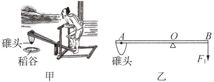 1. 新趋势 传统文化 (2025·福建福州期末)如图甲是古代一种捣谷的舂,其简化原理图如图乙,$OA:AB= 3:5$,捣谷人对B点的作用力$F_{1}$使水平静止的横木转动.若碓头质量为20 kg,g取10 N/kg,不计横木的重力和转动摩擦,下列说法正确的是 ()