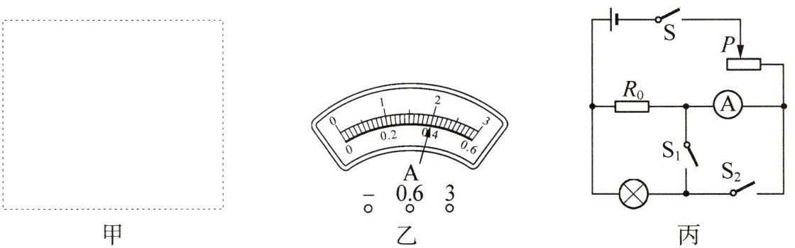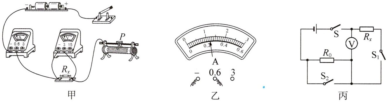 (6) 在缺少电流表时,小龙选用阻值为$R_{0}$的定值电阻设计了如图丙所示电路,并完成实验.过程如下:① 闭合$S和S_{1}$,电压表的示数为$U_{1}$;② 再闭合$S_{2}$,电压表的示数为$U_{2}$;③$R_{x}= $____(用字母$U_{1}$、$U_{2}和R_{0}$表示).