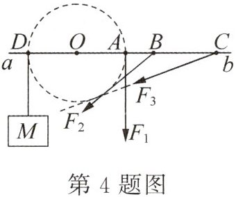 4. 如图,$ab为可绕O$点转动的轻质杠杆,以$O点为圆心的圆与ab相交于A$、$D$两点,$B$、$C为A$点右侧杆上的两点.在杆上$D点挂一个重为G的物体M$.用一弹簧测力计分别在$A$、$B$、$C$三点沿与圆相切的方向施力,都使杠杆在水平位置平衡,所用的力分别为$F_{1}$、$F_{2}和F_{3}$,则 ()