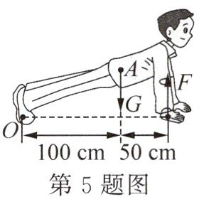 5. (2025·江苏镇江月考)如图所示,小华正在做俯卧撑,可以将他的身体看作一个杠杆,$O$为支点,$A$为他的重心,相关长度已在图中标明.已知他的质量为$60 kg$,则图示时刻地面对小华双手的支持力$F的力臂L_{1}= $____$m$,此时地面对双手的支持力$F= $____$N$.($g取10 N/kg$)