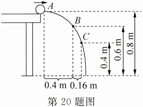 20. 一小球重2N,从水平台面上滚落到地面的过程,经过$A$、$B$、$C$三个位置,如图所示。设小球在$AB段重力做功为W_{1}$,重力的平均功率为$P_{1}$;在$BC段重力做功为W_{2}$,重力的平均功率为$P_{2}$。则$W_{1}= $____J,$P_{1}$____(选填“>”“<”或“=”)$P_{2}$。